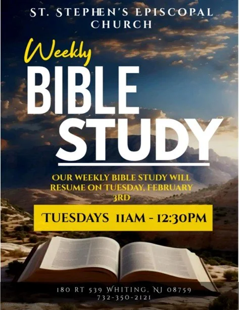 Feb 17 to Aug 25 Weekly Bible Study Tue, Feb 17, 2026 11:00 AM Tue, Aug 25, 2026 12:00 PM St. Stephen's Episcopal Church (map) Google Calendar ICS View Event →