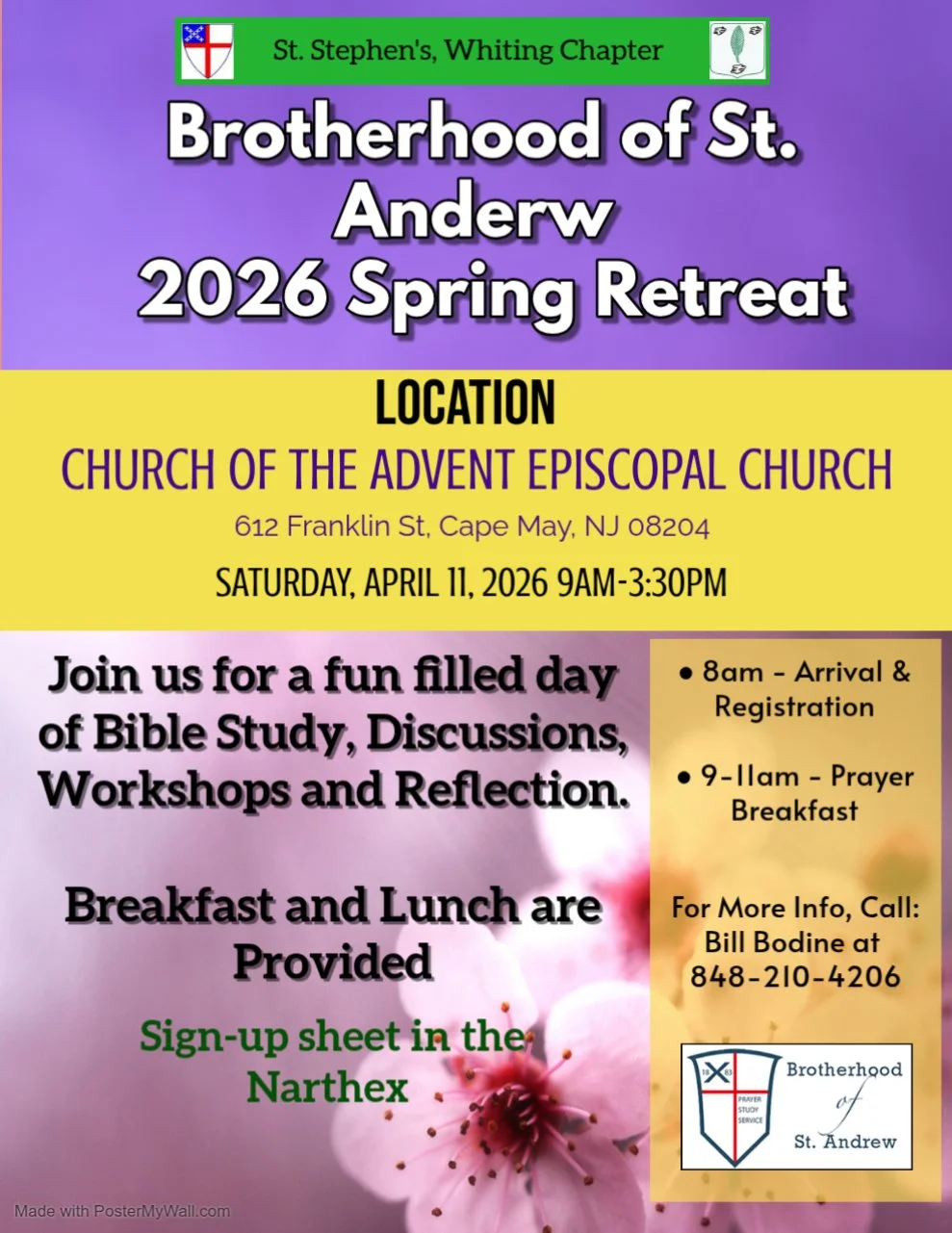 Apr 11 Brotherhood of St. Andrew Spring Retreat Saturday, April 11, 2026 9:00 AM 3:30 PM St. Stephen's Episcopal Church (map) Google Calendar ICS View Event →