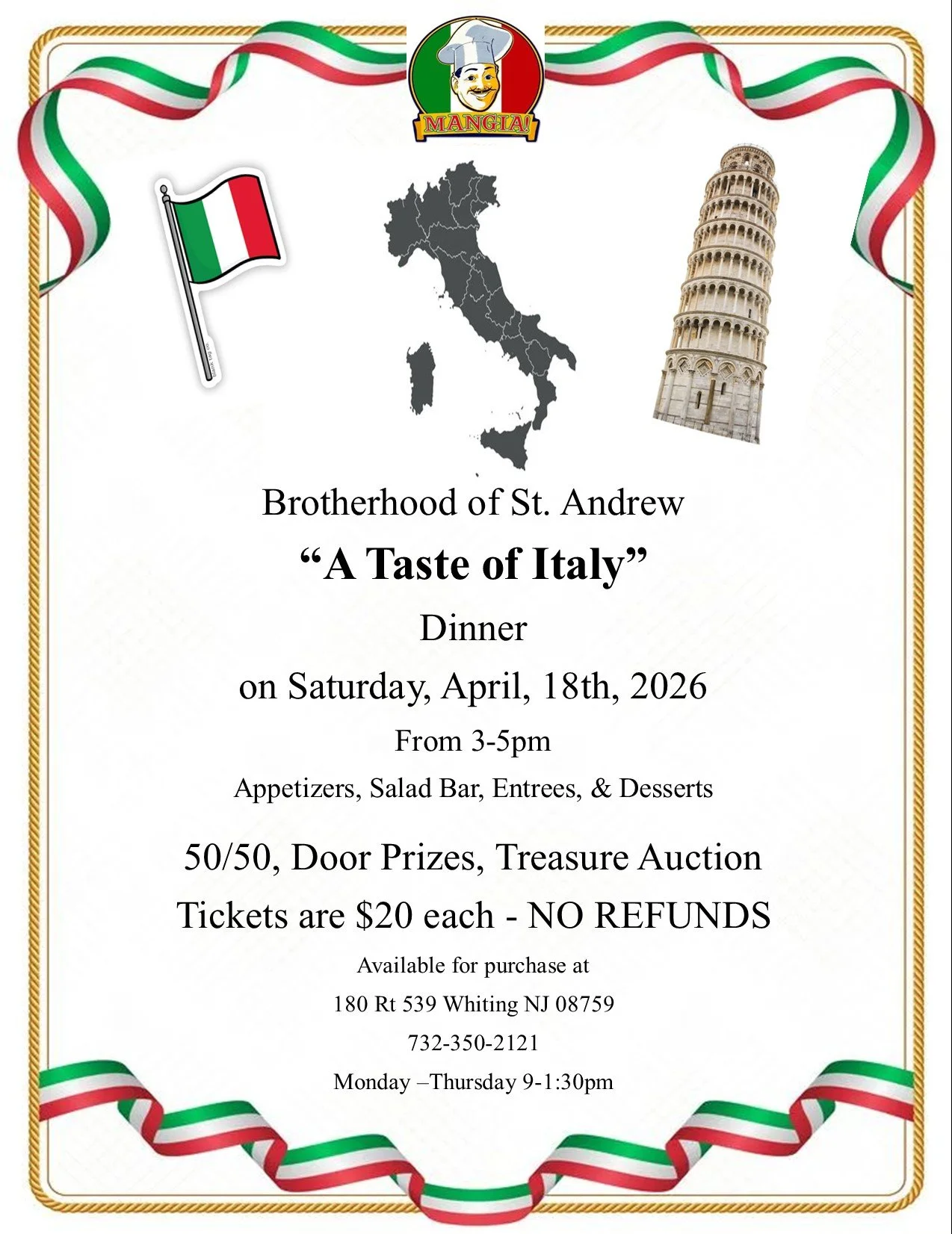 Apr 18 Taste Of Italy Dinner Saturday, April 18, 2026 3:00 PM 5:00 PM St. Stephen's Episcopal Church (map) Google Calendar ICS View Event →
