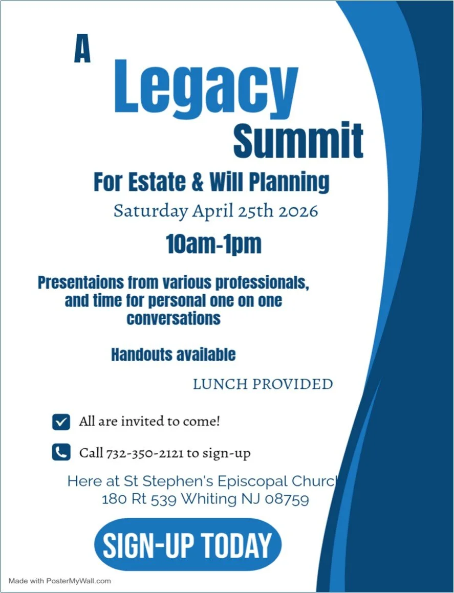 Apr 25 A Legacy Summit, for Estate and Will Planning Saturday, April 25, 2026 10:00 AM 1:00 PM St. Stephen's Episcopal Church (map) Google Calendar ICS View Event →