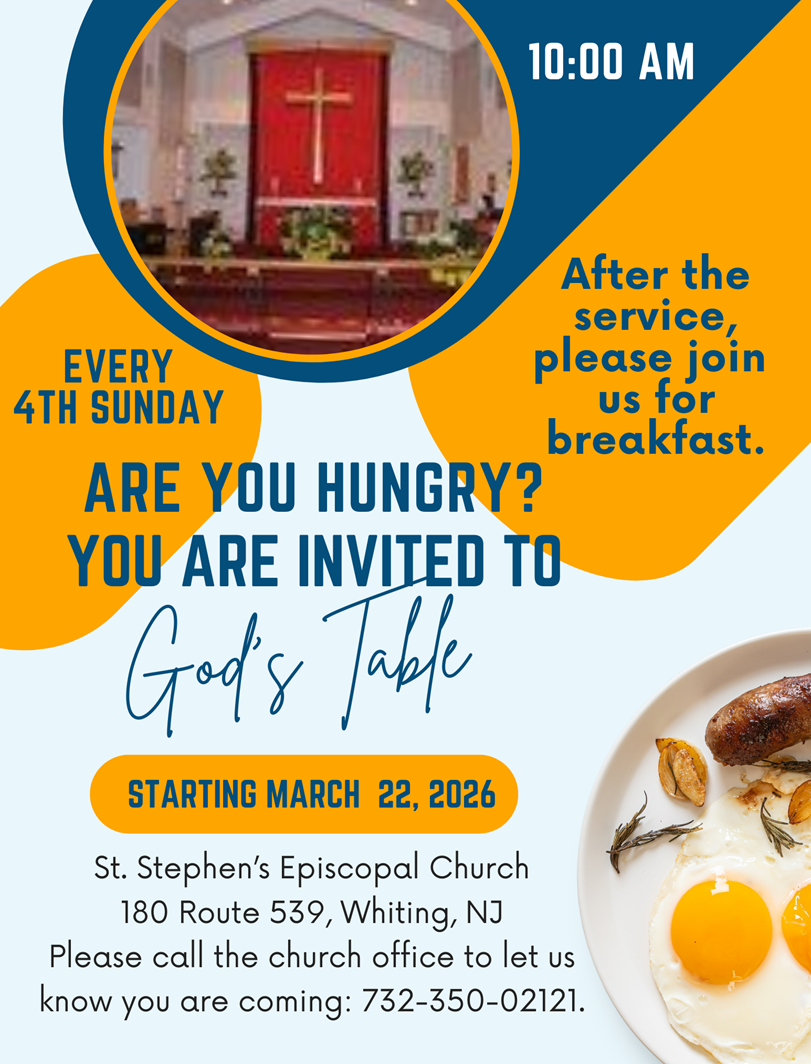 Feb 17 to Aug 25 Weekly Bible Study Tue, Feb 17, 2026 11:00 AM Tue, Aug 25, 2026 12:00 PM St. Stephen's Episcopal Church (map) Google Calendar ICS View Event → Feb 28 Soulful Brunch Saturday, February 28, 2026 12:00 PM 3:00 PM St. Stephen's Episcopal Church (map) Google Calendar ICS View Event → Mar 17 Corned Beef Dinner Tuesday, March 17, 2026 3:00 PM 6:00 PM St. Stephen's Episcopal Church (map) Google Calendar ICS View Event → Mar 22 to Jan 24 God's Table Sun, Mar 22, 2026 11:30 AM Sun, Jan 24, 2027 12:30 PM St. Stephen's Episcopal Church (map) Google Calendar ICS View Event → Apr 11 Brotherhood of St. Andrew Spring Retreat Saturday, April 11, 2026 9:00 AM 3:30 PM St. Stephen's Episcopal Church (map) Google Calendar ICS View Event → Apr 18 Taste Of Italy Dinner Saturday, April 18, 2026 3:00 PM 5:00 PM St. Stephen's Episcopal Church (map) Google Calendar ICS View Event → Apr 25 A Legacy Summit, for Estate and Will Planning Saturday, April 25, 2026 10:00 AM 1:00 PM St. Stephen's Episcopal Church (map) Google Calendar ICS View Event → Feb 14 Valentin's Day Dinner Saturday, February 14, 2026 3:00 PM 6:00 PM St. Stephen's Episcopal Church (map) Google Calendar ICS View Event → Jan 1 New Year's Day Brunch Thursday, January 1, 2026 11:00 AM 2:00 PM St. Stephen's Episcopal Church (map) Google Calendar ICS View Event → Dec 13 A Christmas Tea PArty Saturday, December 13, 2025 1:00 PM 3:00 PM St. Stephen's Episcopal Church (map) Google Calendar ICS View Event → Nov 27 Thanksgiving Turkey Dinner Thursday, November 27, 2025 11:00 AM 1:00 PM St. Stephen's Episcopal Church (map) Google Calendar ICS View Event → Nov 16 Pinelands Symphonic Band Concert Sunday, November 16, 2025 2:00 PM 4:00 PM St. Stephen's Episcopal Church (map) Google Calendar ICS View Event → Oct 26 Blessing of the Animals Sunday, October 26, 2025 10:00 AM 11:00 AM St. Stephen's Episcopal Church (map) Google Calendar ICS View Event → Oct 25 Holiday Craft & Vendor Fair Saturday, October 25, 2025 9:00 AM 1:00 PM St. Stephen's Episcopal Church (map) Google Calendar ICS View Event → Sep 11 Bus Trip to the Shrine of St. Joseph Thursday, September 11, 2025 9:00 AM 5:30 PM St. Stephen's Episcopal Church (map) Google Calendar ICS View Event → Aug 23 Dignified Junque Annual Fair Saturday, August 23, 2025 8:00 AM 2:00 PM St. Stephen's Episcopal Church (map) Google Calendar ICS View Event → Aug 9 Morning Prayer & Breakfast Saturday, August 9, 2025 9:30 AM 12:00 PM St. Stephen's Episcopal Church (map) Google Calendar ICS View Event → Aug 2 B.of.S.A., Dance Party for all ages Saturday, August 2, 2025 12:00 PM 4:00 PM St. Stephen's Episcopal Church (map) Google Calendar ICS View Event → Jul 26 Woman's Retreat Saturday, July 26, 2025 10:00 AM 3:00 PM St. Stephen's Episcopal Church (map) Google Calendar ICS View Event → Jul 19 Healing Mission Retreat Saturday, July 19, 2025 8:00 AM 3:00 PM St. Stephen's Episcopal Church (map) Google Calendar ICS View Event → Jul 19 Brotherhood of St. Andrew Mission Retreat Saturday, July 19, 2025 8:00 AM 3:00 PM St. Stephen's Episcopal Church (map) Google Calendar ICS View Event → Jul 12 Bluegrass and Blueberry Social Saturday, July 12, 2025 1:00 PM 3:00 PM St. Stephen's Episcopal Church (map) Google Calendar ICS View Event → Jun 28 Brotherhood of St. Andrew Chicken Dinner Saturday, June 28, 2025 4:00 PM 6:00 PM St. Stephen's Episcopal Church (map) Google Calendar ICS View Event → Jun 22 to Aug 17 Summer Bible Study Sun, Jun 22, 2025 12:30 PM Sun, Aug 17, 2025 12:30 PM St. Stephen's Episcopal Church (map) Google Calendar ICS View Event → Jun 14 Trivia Night Saturday, June 14, 2025 1:00 PM 3:00 PM St. Stephen's Episcopal Church (map) Google Calendar ICS View Event → Jun 7 BOFSA Gathering of Speakers Saturday, June 7, 2025 12:00 PM 4:30 PM St. Stephen's Episcopal Church (map) Google Calendar ICS View Event → May 14 Line Dance Social Wednesday, May 14, 2025 7:00 PM 9:30 PM St. Stephen's Episcopal Church (map) Google Calendar ICS View Event → Apr 26 Legacy Summit for Estate and Will Planning Saturday, April 26, 2025 10:00 AM 2:00 PM St. Stephen's Episcopal Church (map) Google Calendar ICS View Event → Mar 23 King of the Hill Sunday, March 23, 2025 6:00 PM 7:00 PM Playdrome Lanes (map) Google Calendar ICS View Event → Mar 17 Corned Beef and Cabbage Dinner Monday, March 17, 2025 4:00 PM 6:00 PM St. Stephen's Episcopal Church (map) Google Calendar ICS View Event → Feb 22 Soulful Brunch Saturday, February 22, 2025 12:00 PM 3:00 PM St. Stephen's Episcopal Church (map) Google Calendar ICS View Event → Feb 14 Valetnine's Day Dinner Friday, February 14, 2025 3:00 PM 3:00 PM St. Stephen's Episcopal Church (map) Google Calendar ICS View Event → Dec 22 to Dec 23 KING OF THE HILL Sun, Dec 22, 2024 6:00 PM Mon, Dec 23, 2024 12:55 AM St. Stephen's Episcopal Church (map) Google Calendar ICS View Event → Dec 7 BREAKFAST WITH SANTA Saturday, December 7, 2024 9:00 AM 11:00 AM St. Stephen's Episcopal Church (map) Google Calendar ICS View Event → Nov 24 Pinelands Symphonic Band Concert Sunday, November 24, 2024 2:00 PM 3:00 PM St. Stephen's Episcopal Church (map) Google Calendar ICS View Event → Nov 17 Bake Sale Sunday, November 17, 2024 9:00 AM 1:00 PM St. Stephen's Episcopal Church (map) Google Calendar ICS View Event → Oct 26 Holiday Craft & Vendor Fair Saturday, October 26, 2024 9:00 AM 1:00 PM St. Stephen's Episcopal Church (map) Google Calendar ICS View Event →